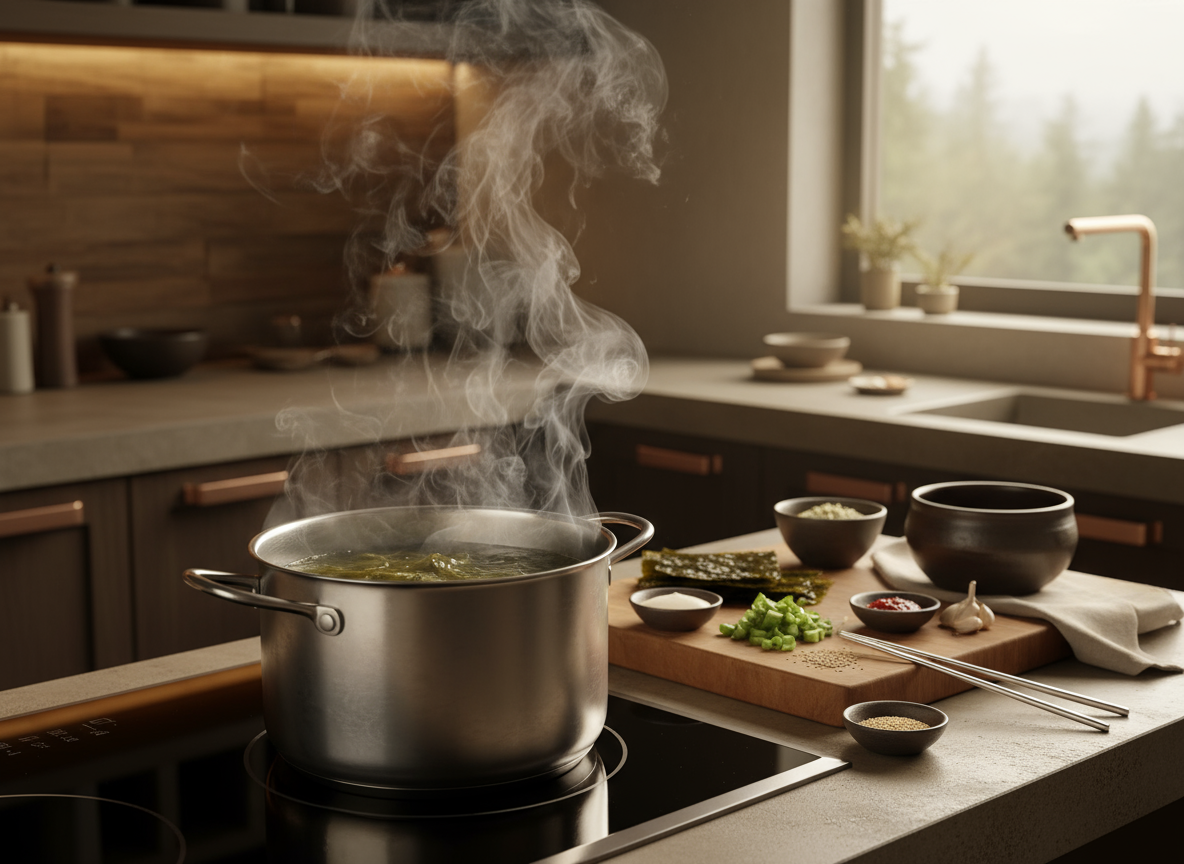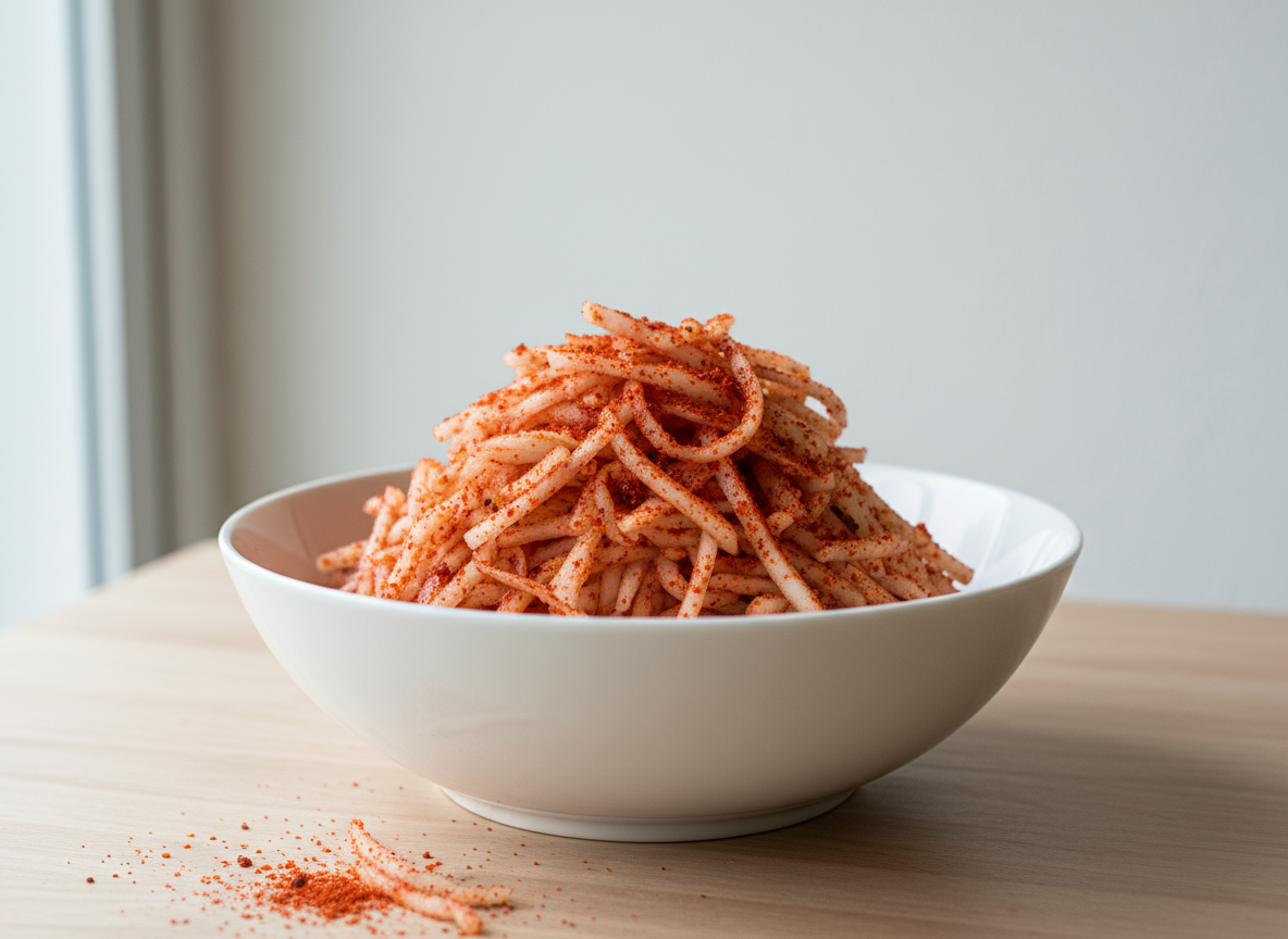 A: 무에서 수분이 덜 나왔거나 찹쌀풀이 너무 되게 쑤어졌을 수 있습니다. 이때는 절대로 물을 붓지 마시고, '배'나 '양파'를 추가로 갈아 즙을 내어 섞어주세요. 혹은 미리 준비해둔 차가운 다시마 육수를 조금 보충하여 농도를 맞추는 것이 좋습니다.