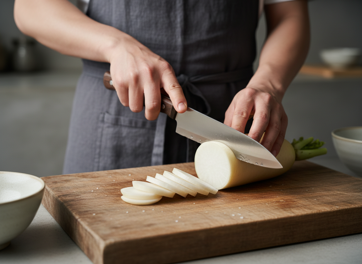 무는 나박하게 얇게 썰어주는 것이 중요합니다. 무를 얇게 썰면 물과 닿는 면적이 넓어져 무 특유의 시원한 맛이 국물에 잘 우러나고, 조리 시간도 단축됩니다. 두께는 0.3-0.5cm 정도가 적당하죠.