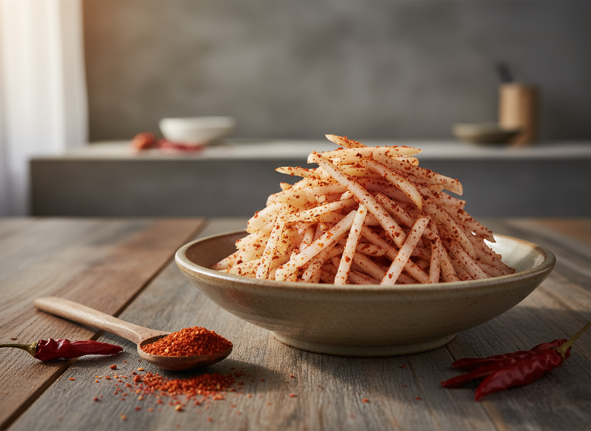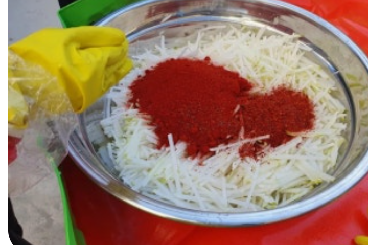 무 3개는 깨끗이 씻어 채칼로 가늘게 채 썰어줍니다. 큰 볼에 무채를 담고 고춧가루를 먼저 넣어 잘 버무려주세요. 고춧가루가 무에 먼저 배면 색이 예쁘게 나고 맛도 더 좋습니다.