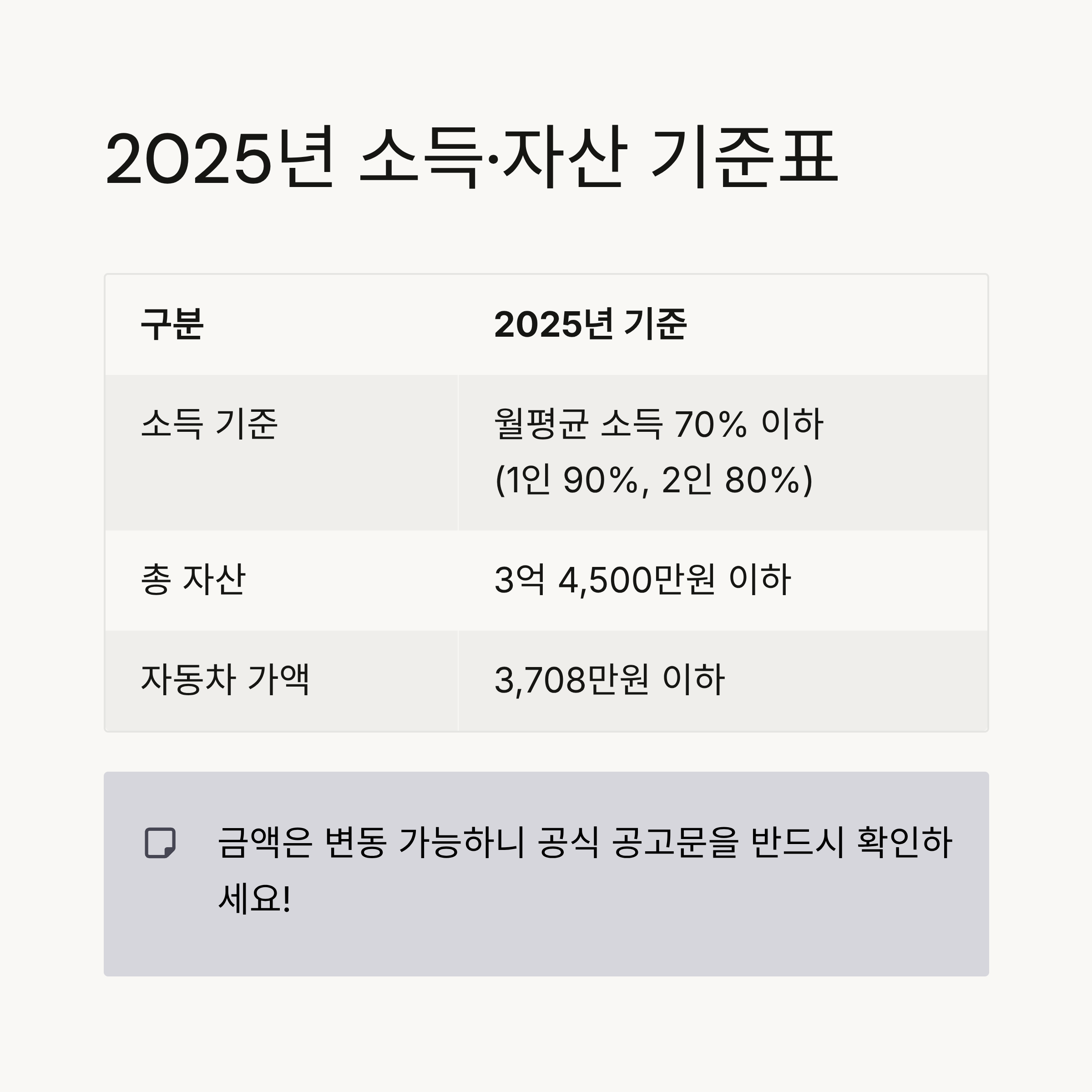 | 소득 기준 | 전년도 도시근로자 가구원수별 가구당 월평균 소득의 70% 이하 (1인 가구는 90%, 2인 가구는 80%) |
