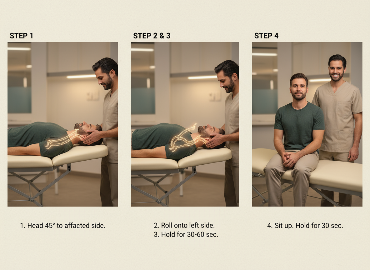 2. 눕기: 고개를 돌린 상태를 유지하며 어깨와 머리가 침대 가장자리에 살짝 걸쳐질 정도로 뒤로 눕습니다. 이 자세에서 어지럼증이 나타나며, 사라질 때까지 약 30초~1분간 유지합니다.