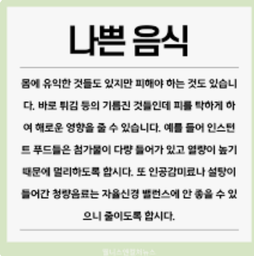 A: 특별히 정해진 음식은 없지만, 전반적인 건강 관리가 중요합니다. 과도한 나트륨 섭취는 내림프액의 압력을 높일 수 있으므로 짠 음식을 피하고, 혈액순환에 방해가 되는 카페인, 술, 담배를 줄이는 것이 도움이 될 수 있습니다.