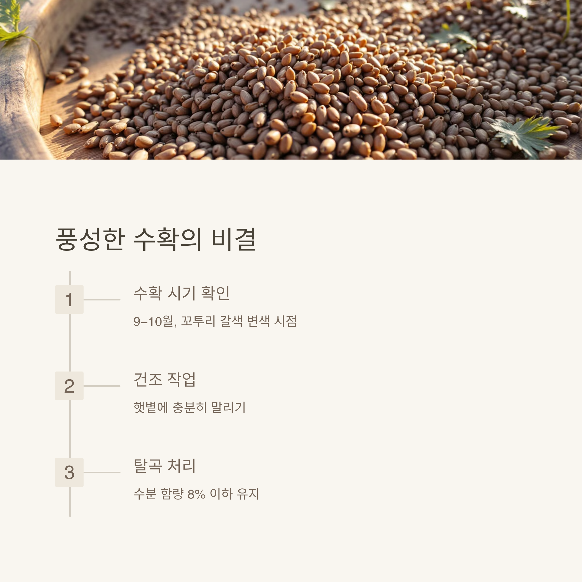 수확은 낫으로 줄기를 비스듬히 자른 뒤, 비닐 위에서 10~15일 말려요. 꼬투리가 마르면 도리깨로 두드려 씨앗을 털어내세요. 들깨 파종시기부터 약 120일 후면 고소한 들깨를 맛볼 수 있어요!