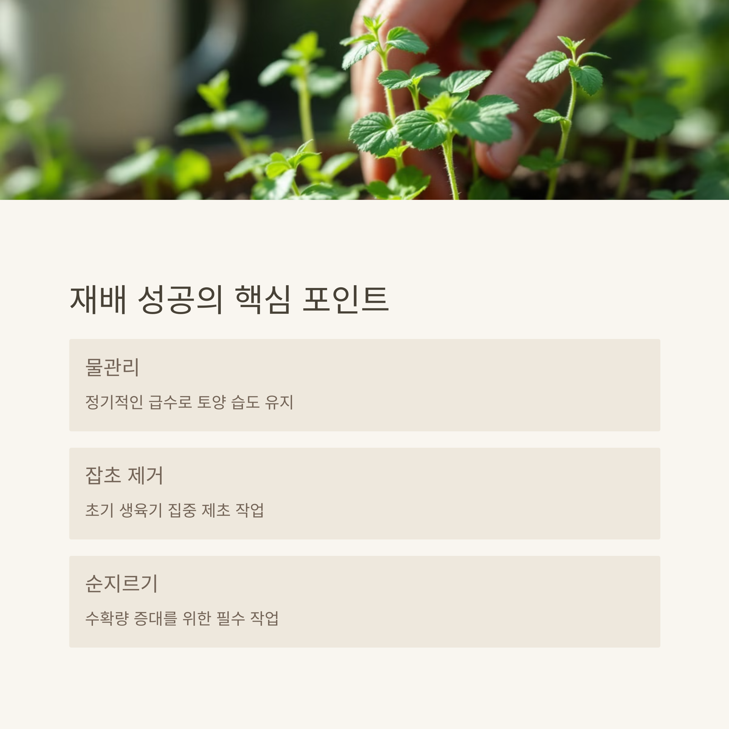- 잡초 제거: 생육 초기에는 수시로 뽑아주기.