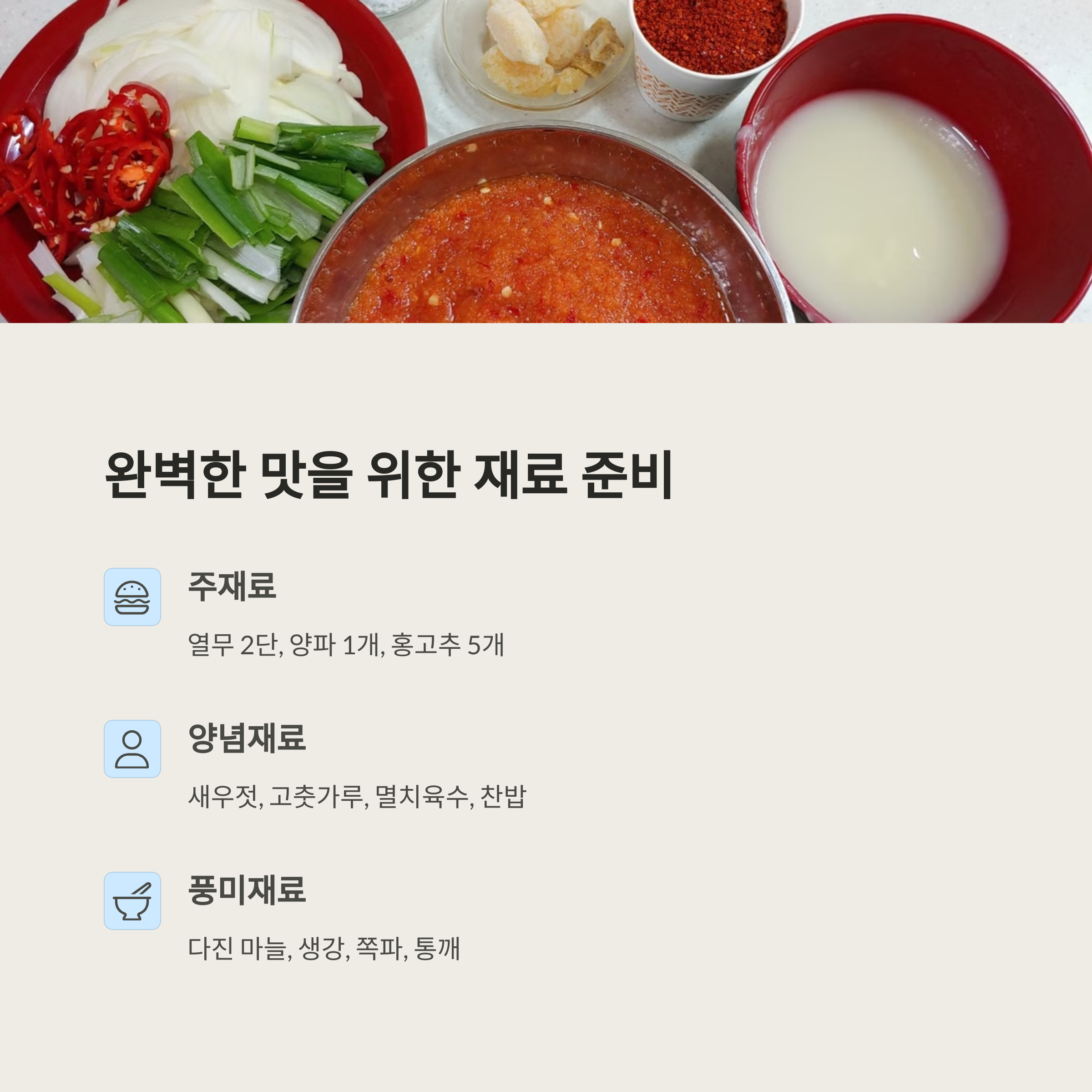 맛있는 열무김치를 담그기 위해 필요한 재료를 꼼꼼히 준비해봅시다. 재료의 신선도와 품질이 맛있는 열무김치의 비결입니다.