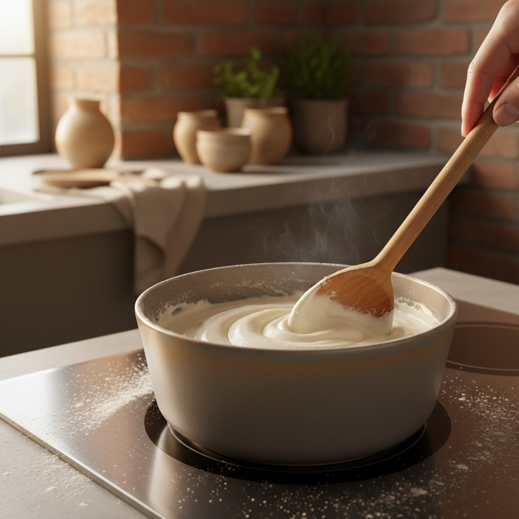 무를 절이는 동안 밀가루풀을 만들어주세요. 찹쌀가루가 있다면 찹쌀가루로 만들면 더욱 좋아요. 밀가루 1큰술에 물 80ml를 넣고 잘 풀어서 약한 불에 끓여주세요. 거품이 보글보글 올라오면 10초 정도 더 끓인 후 불을 끄고 완전히 식혀둡니다.