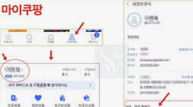 로그인 후 화면 우측 상단에 있는 마이쿠팡 버튼을 클릭합니다. 좌측 메뉴에서 MY 정보 섹션 하단에 있는 개인정보확인 또는 수정 메뉴를 선택하세요.