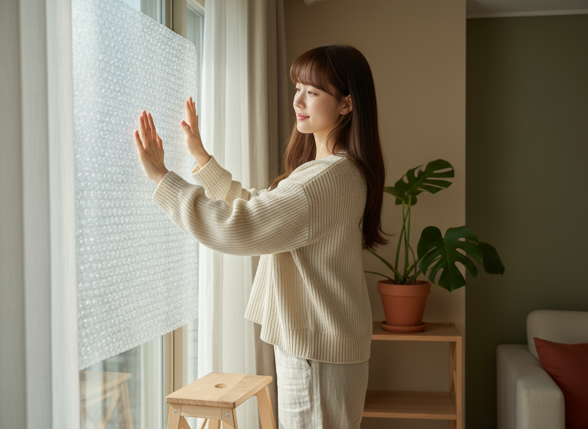 창문에 에어캡(뽁뽁이)을 붙이고 문풍지를 설치하면 외풍을 효과적으로 차단할 수 있어요. 창문 바깥쪽보다는 안쪽에, 1겹보다는 2겹을 붙이는 게 단열에 더 효율적입니다.