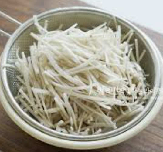 손질한 우엉은 먹기 좋은 크기로 채 썰어 줍니다. 너무 얇으면 식감이 사라지고 너무 두꺼우면 간이 잘 배지 않으니 약 0.3~0.5cm 두께로 어슷썰기 한 뒤 채를 썰어주세요. 썰어둔 우엉은 식초물에 10분 정도 담가 아린 맛을 뺀 후, 흐르는 물에 헹궈 물기를 빼줍니다.