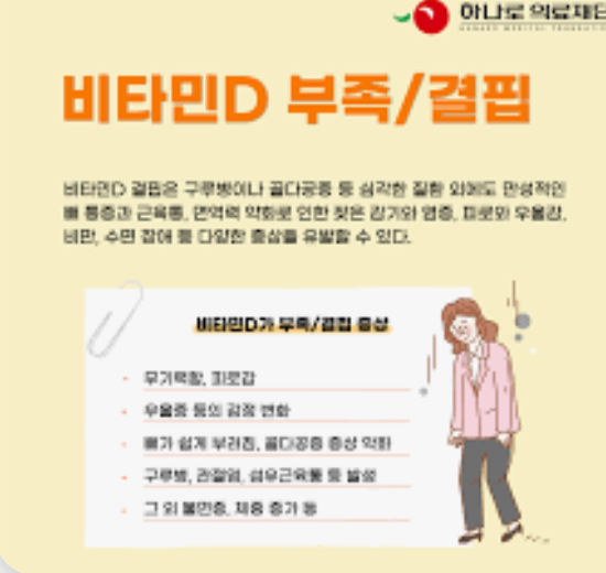 비타민D는 칼슘이 체내에 흡수되도록 돕는 결정적인 역할을 합니다. 이것이 부족하면 아무리 칼슘을 많이 먹어도 뼈로 가지 않고 배출되어 버립니다. "뼈가 시리다"는 표현처럼 뼈와 허리에 둔한 통증이 지속되는 것이 대표적인 비타민d 부족증상입니다.