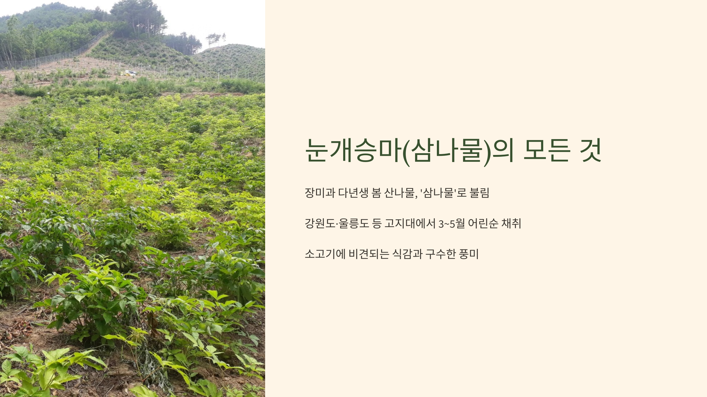 눈개승마는 장미과 다년생 식물로, 3월 말~5월 초 강원도, 울릉도 등 고지대에서 어린 순을 채취한다. 사포닌, 베타카로틴, 칼슘, 철분이 풍부해 항산화, 혈관 건강, 면역력 증진에 도움을 준다.