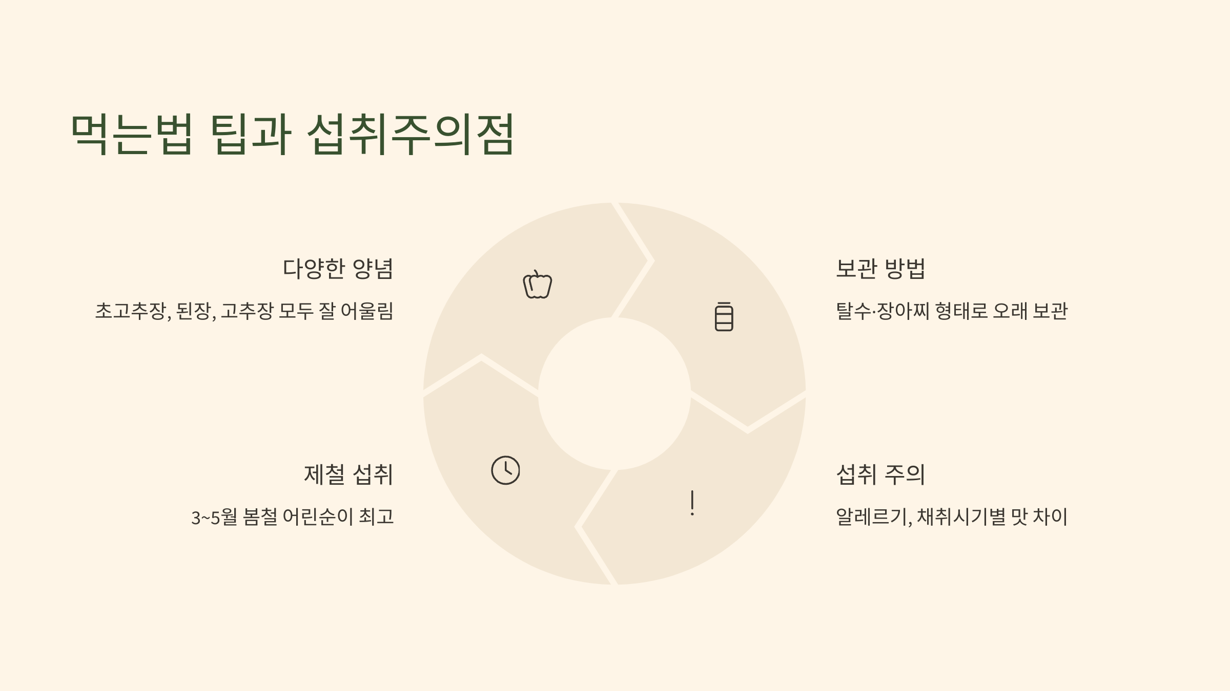 -데치기 필수: 사포닌의 쓴맛과 소화 부담을 줄이려면 생으로 먹는 것보다 데치는 게 좋다. 3~5분 데치면 충분.