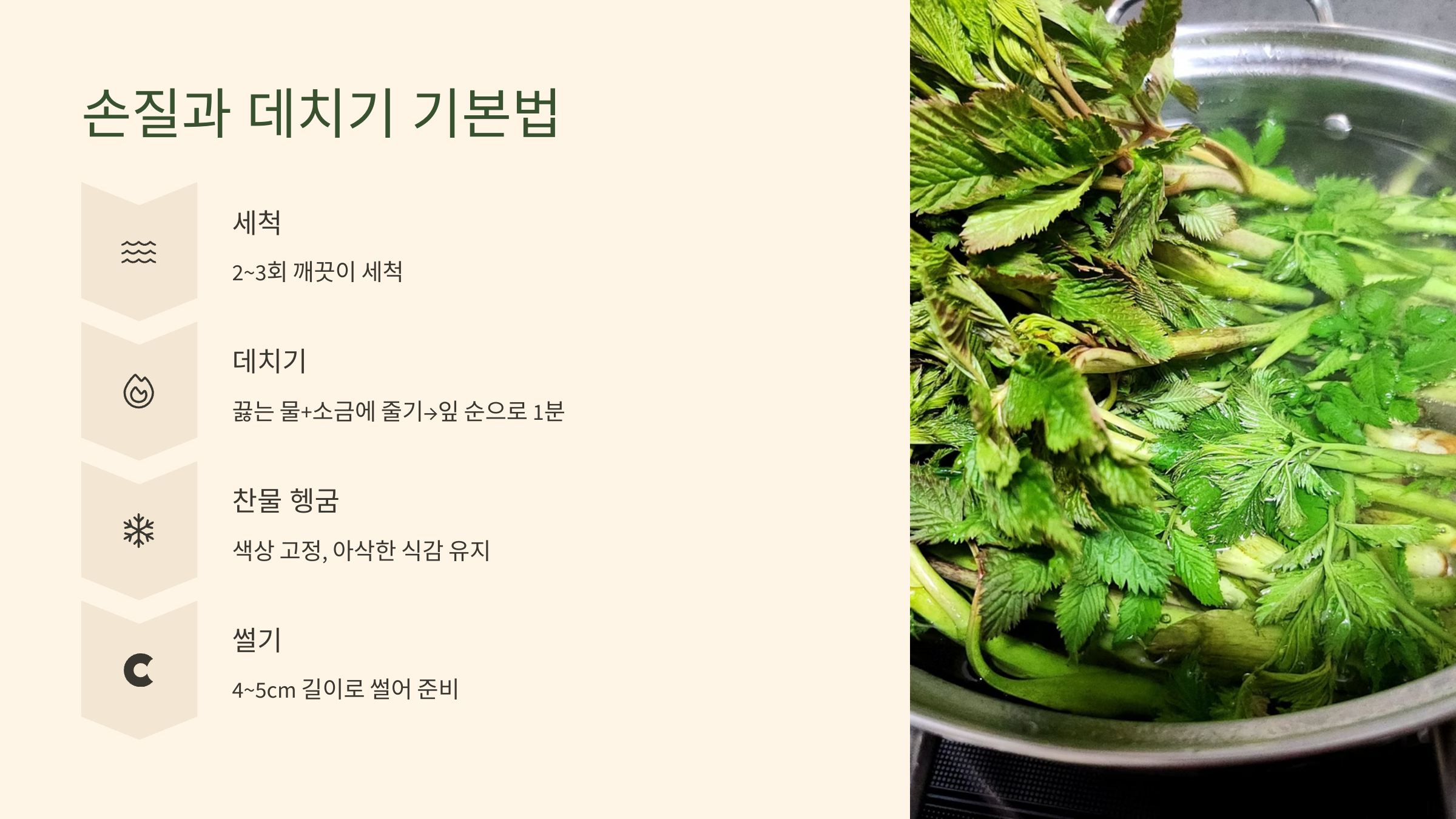 -데치기 필수: 사포닌의 쓴맛과 소화 부담을 줄이려면 생으로 먹는 것보다 데치는 게 좋다. 3~5분 데치면 충분.