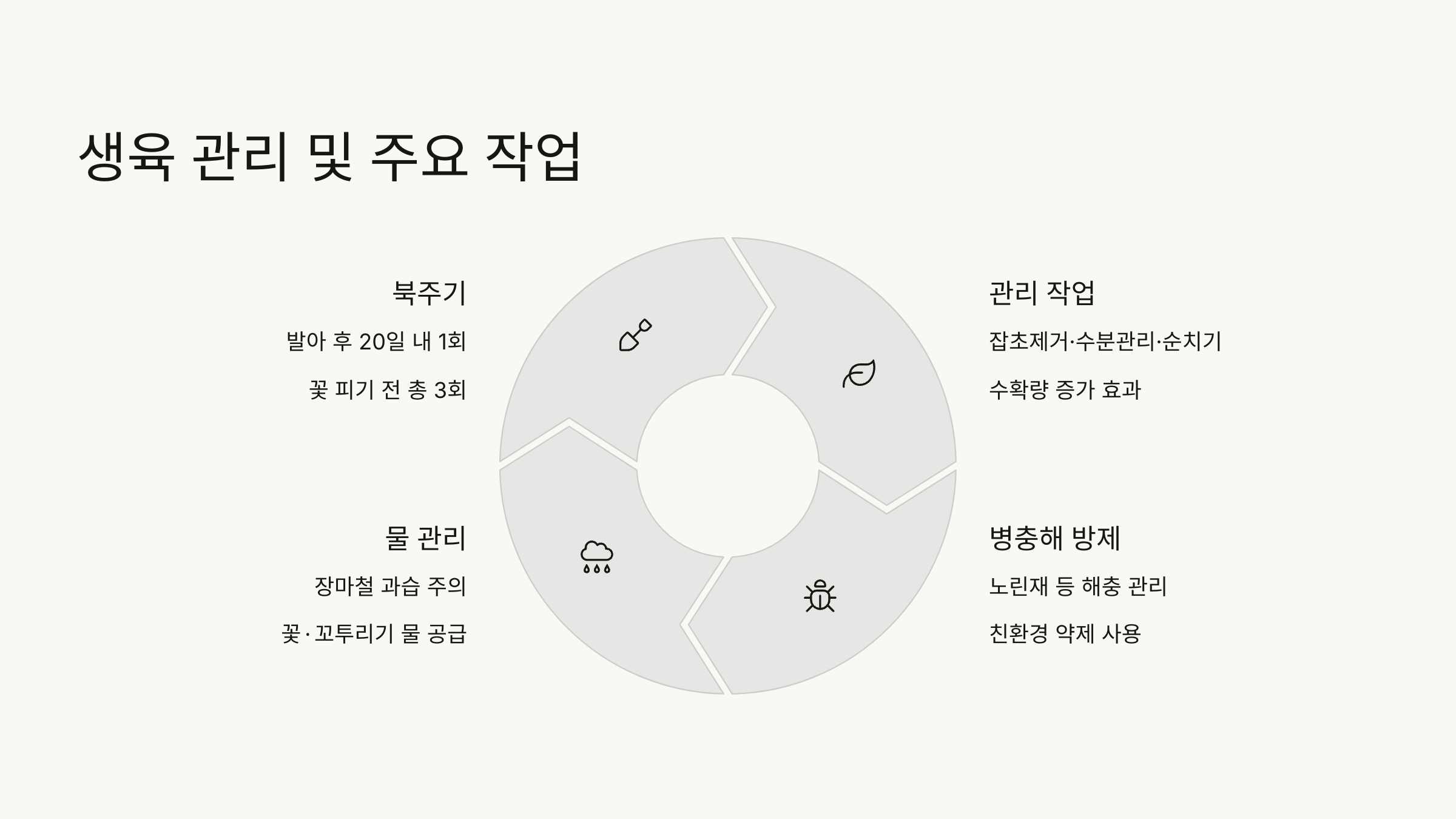 - 생육기간: 파종 후 수확까지 약 120~150일 소요