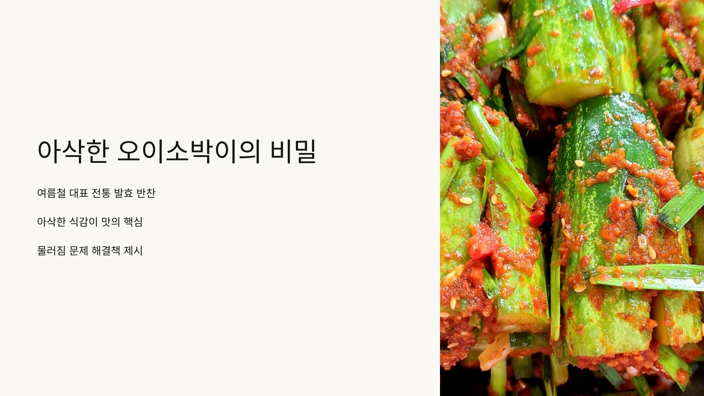 여름철 밥상에 빠질 수 없는 오이소박이는 아삭한 식감이 일품인 전통 발효 음식입니다. 하지만 많은 분들이 오이소박이를 담그면서 금세 물러지는 문제로 고민하시죠.