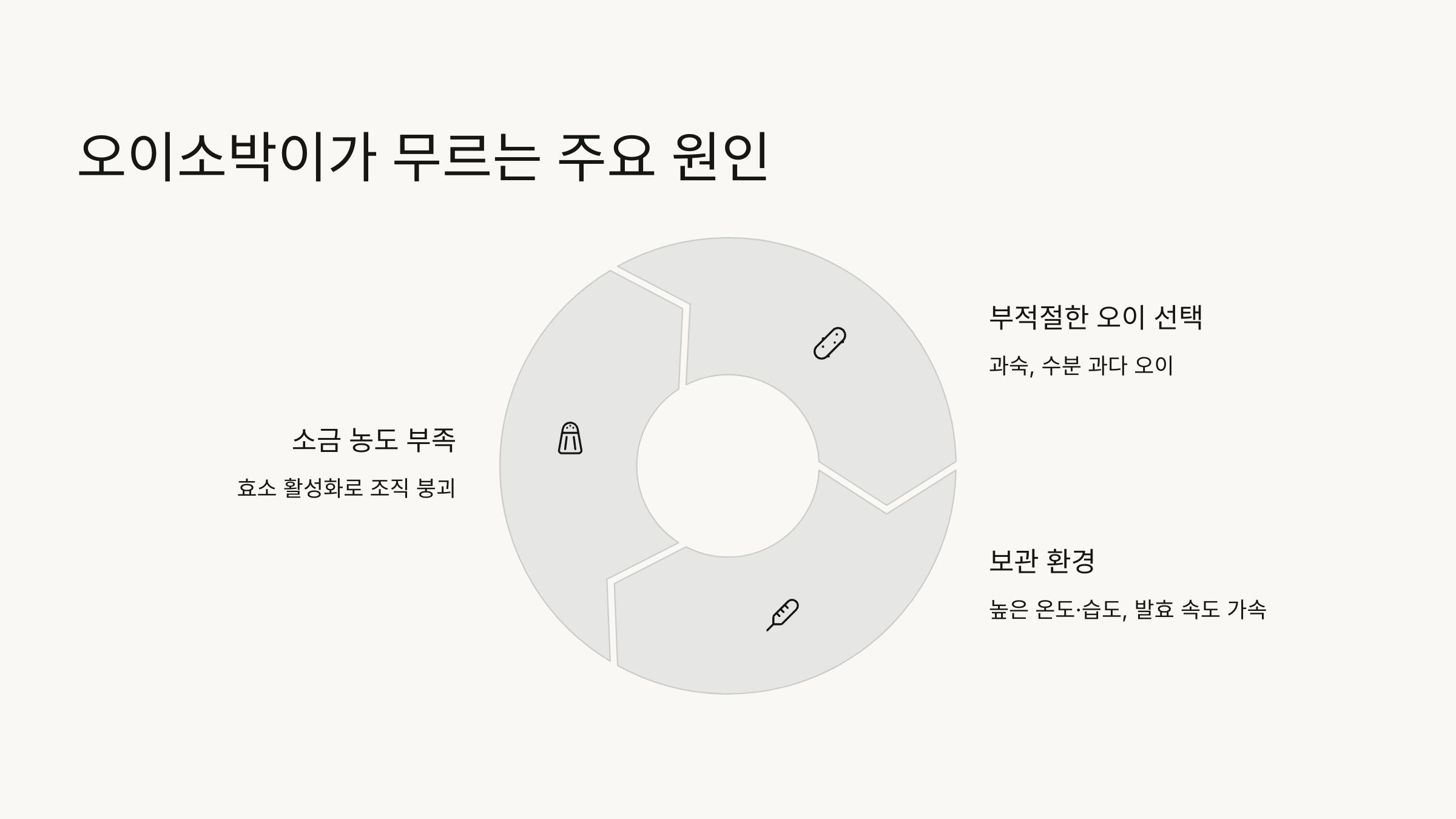| 소금 농도 부족 | 소금물 농도가 낮으면 효소 활성화가 과도하게 일어나 오이 조직이 빠르게 물러집니다. |