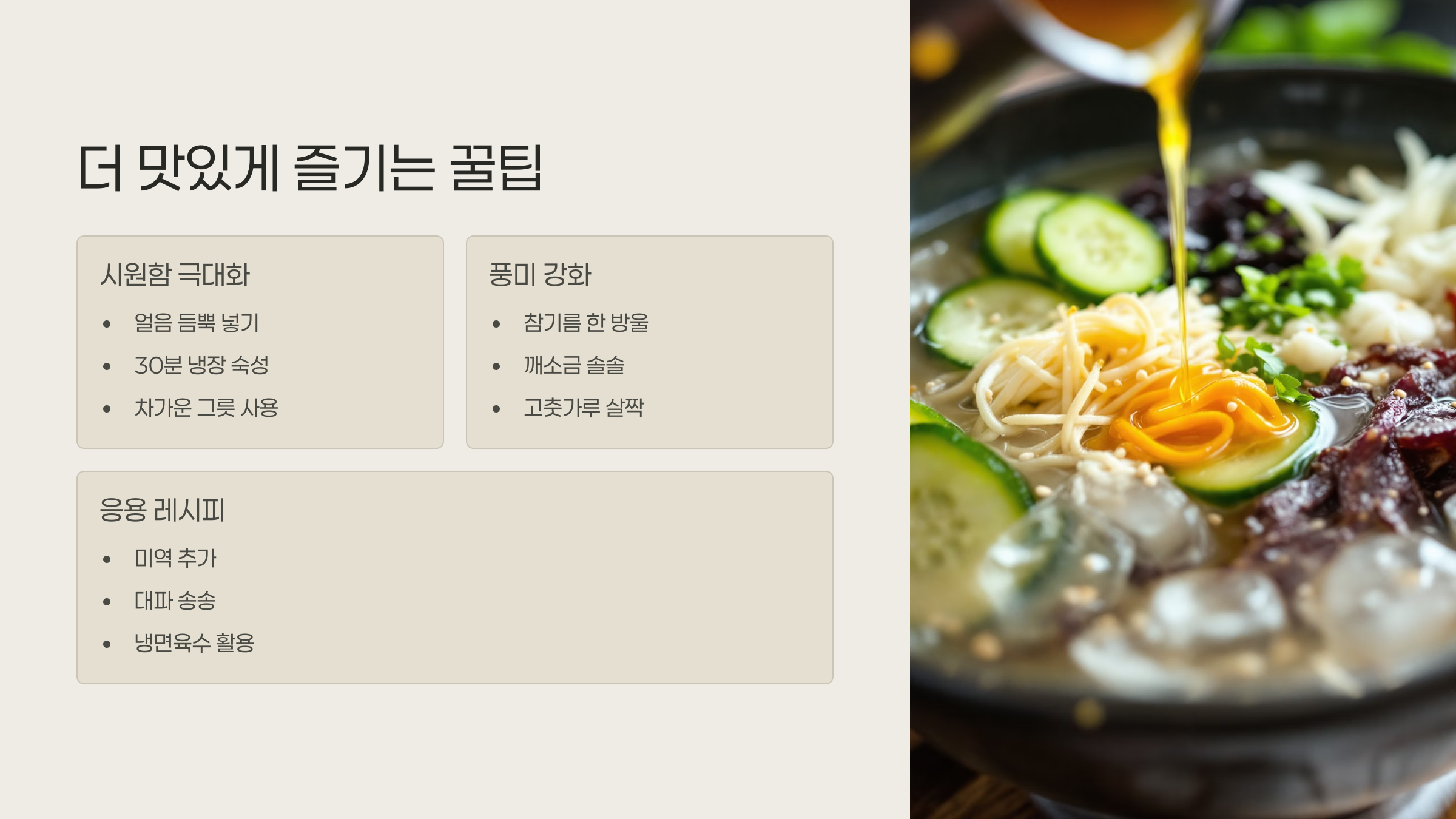 - 국물 온도: 차갑게 먹는 것이 맛있습니다. 냉장고에서 1시간 이상 충분히 냉장 후 드세요.