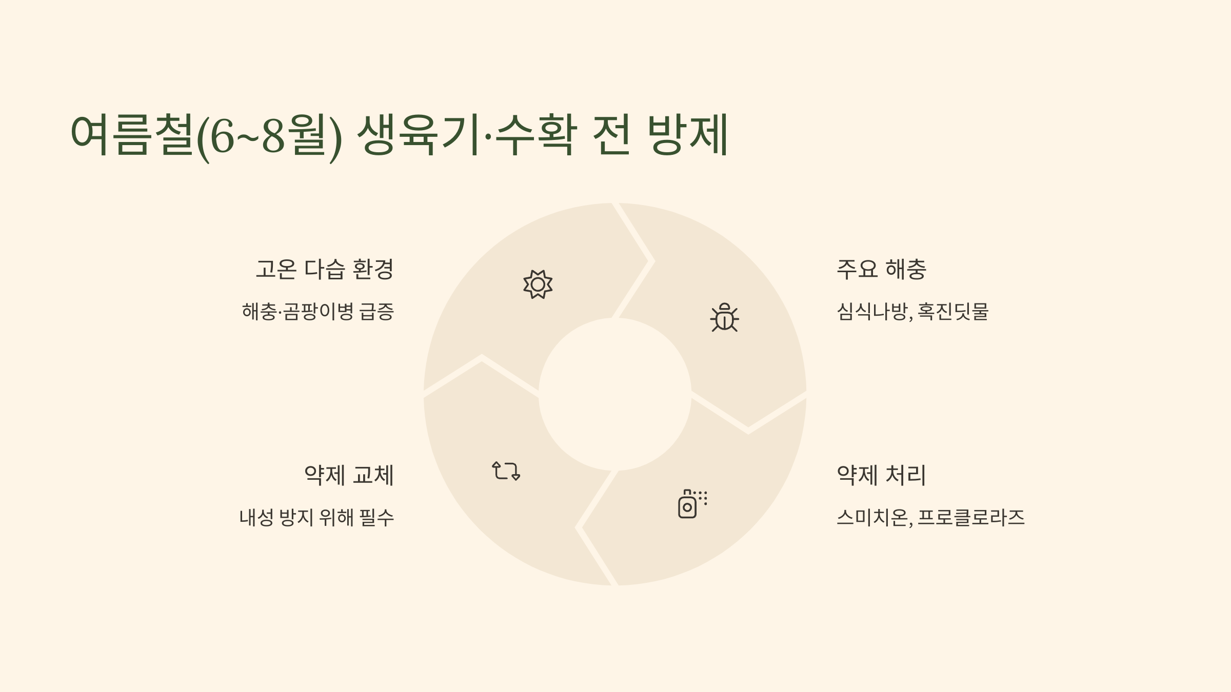 4. 내성 관리: 같은 계통의 약제를 연속 사용하지 않고 다른 계통의 약제로 번갈아 사용합니다.