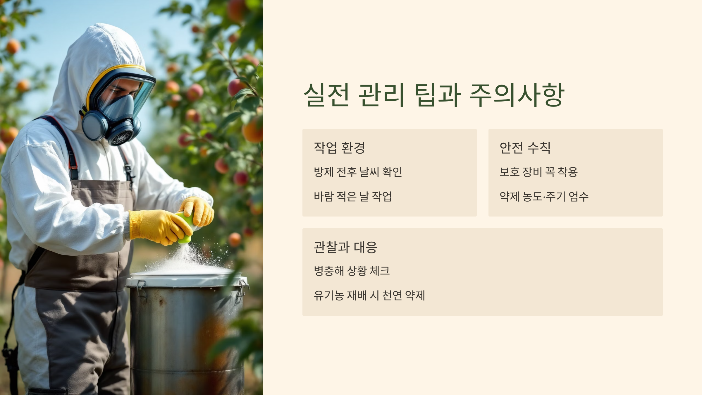 A: 유기농 재배시에는 석회유황합제, 보르도액, 목초액, 유기농 인증 약제를 활용할 수 있습니다. 방제 시기는 일반 재배와 동일하지만, 더 자주 약제를 살포해야 할 수 있습니다. 천적 활용, 페로몬 트랩, 끈끈이 트랩 등의 물리적 방제법을 병행하고, 예방 위주의 관리가 특히 중요합니다.
