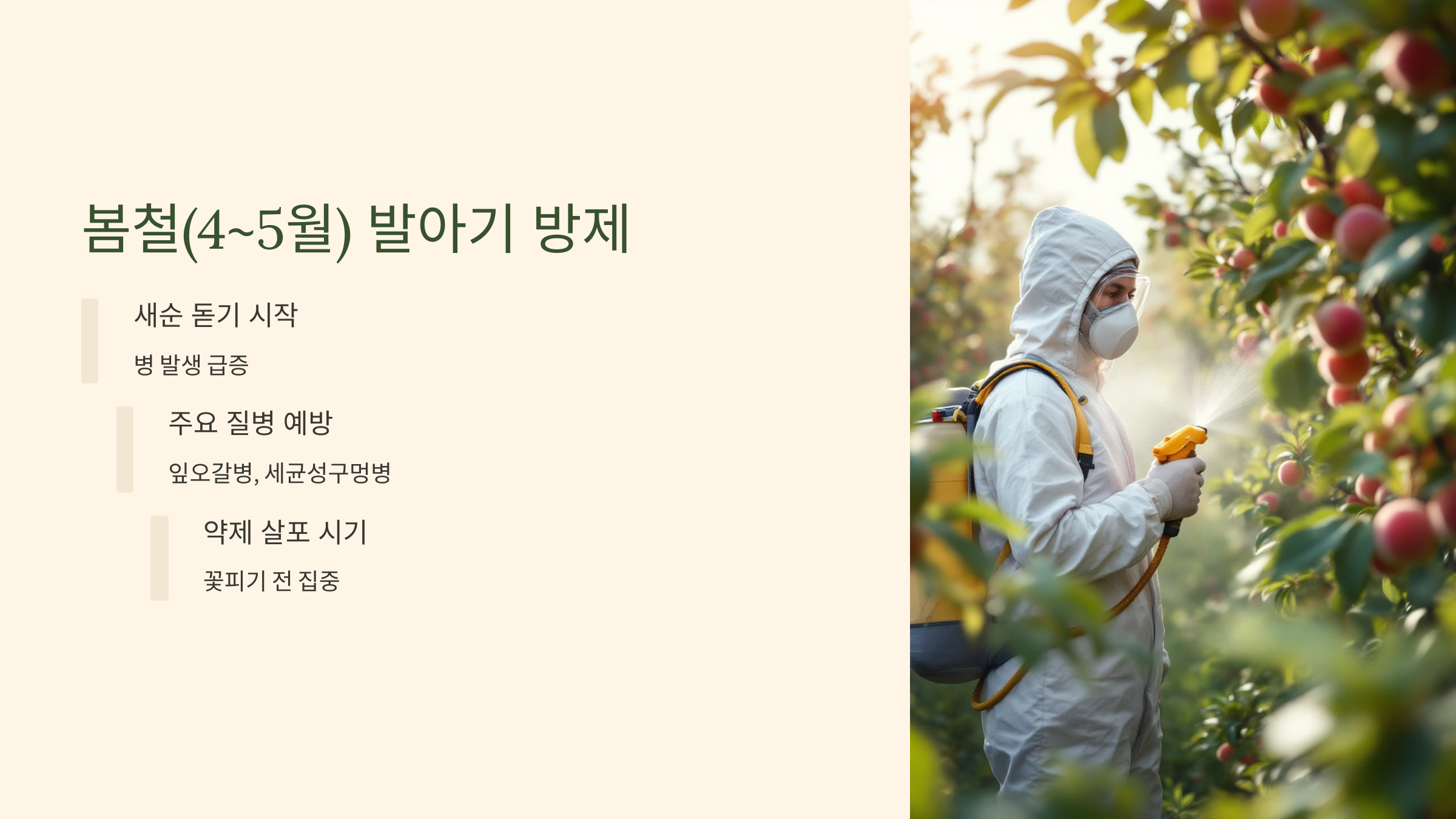 봄철은 세균성구멍병과 잎오갈병 예방이 중요한 시기입니다. 발아기부터 개화 전까지 철저히 약제를 살포하고, 개화기에는 꿀벌의 수분 활동을 방해하지 않도록 주의합니다. 특히 비 오기 전후에는 살균제를 추가로 살포하여 병 발생을 예방해야 합니다.