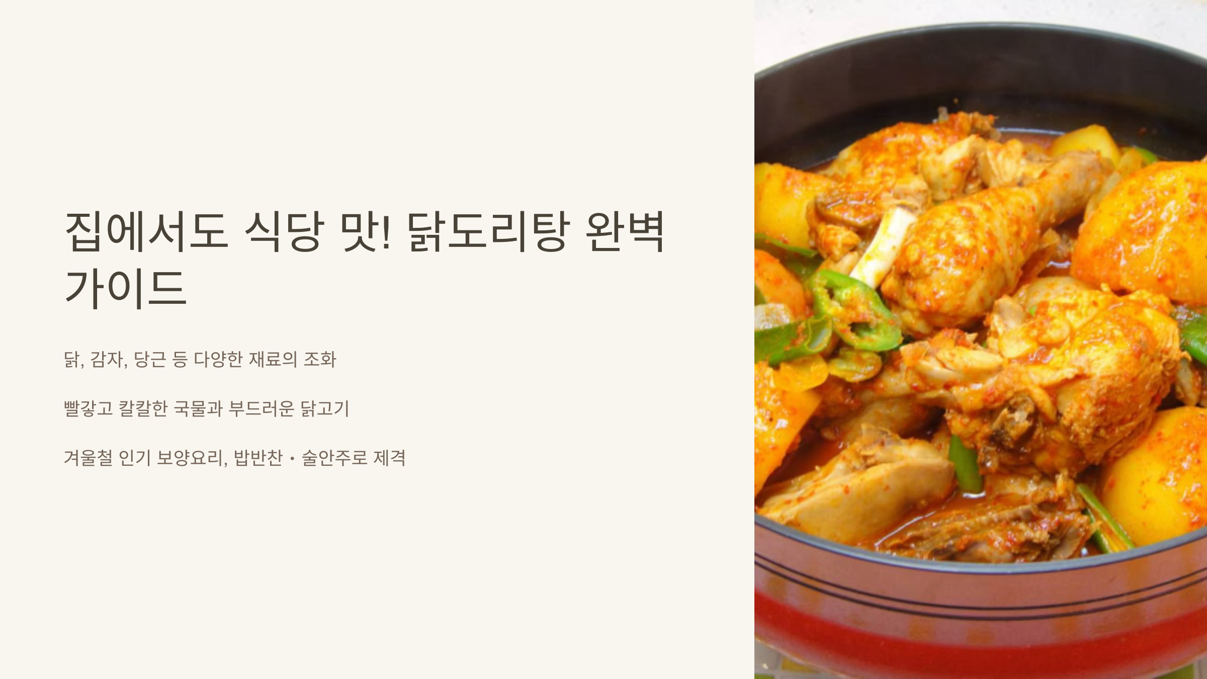 오늘은 가정에서도 식당 맛 그대로 닭도리탕 맛있게 만드는법을 상세히 알려드립니다. 비법 양념부터 황금 레시피까지, 이 글만 따라하면 누구나 프로급 닭도리탕을 만들 수 있어요!