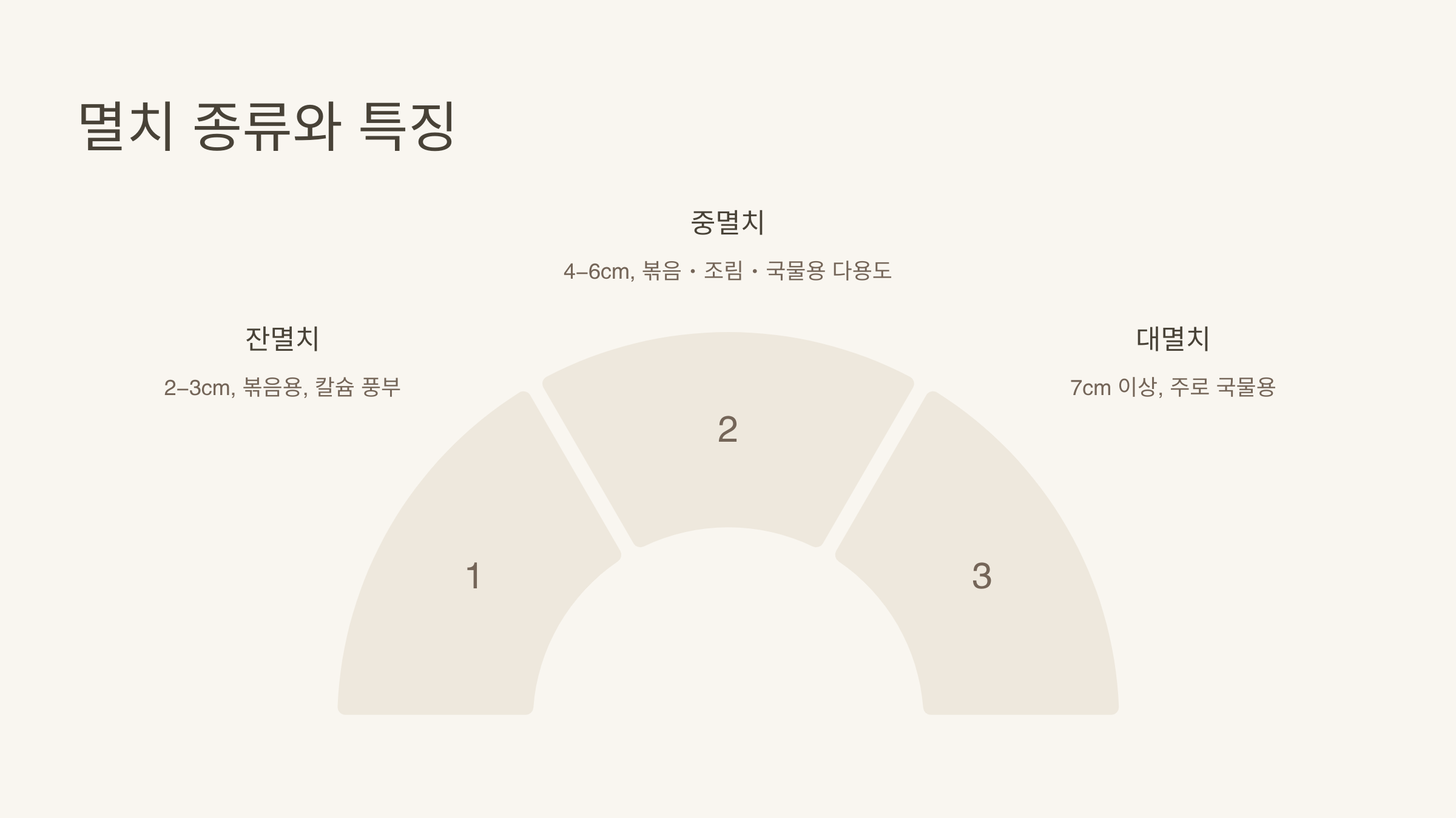| 잔멸치(소멸치) | 2-3cm 크기, 볶음용으로 적합, 칼슘 함량 높음 |