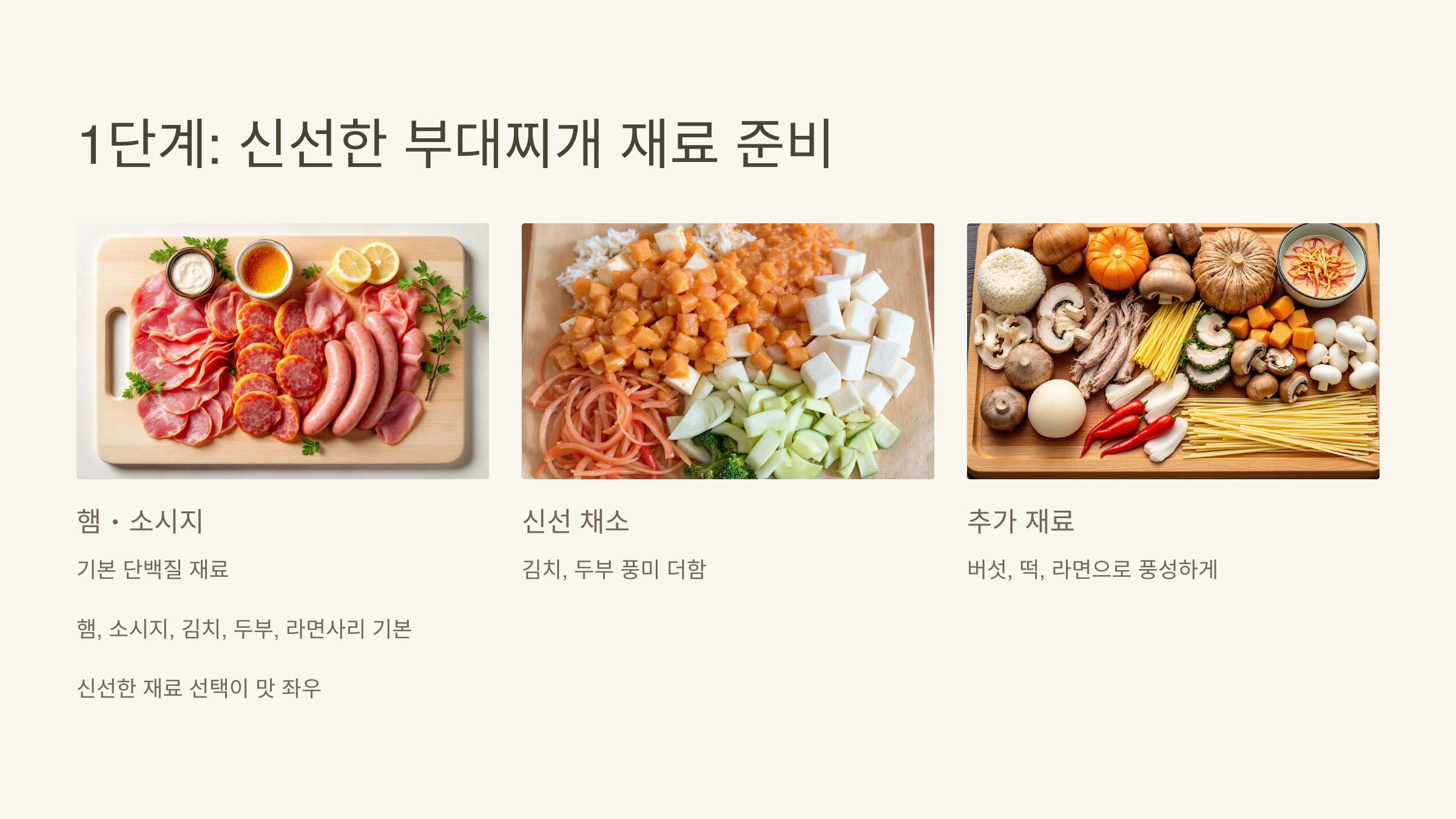 맛있는 부대찌개의 시작은 신선한 재료에서 시작됩니다. 기본 재료와 추가 재료를 적절히 조합하여 나만의 풍미를 만들어보세요.