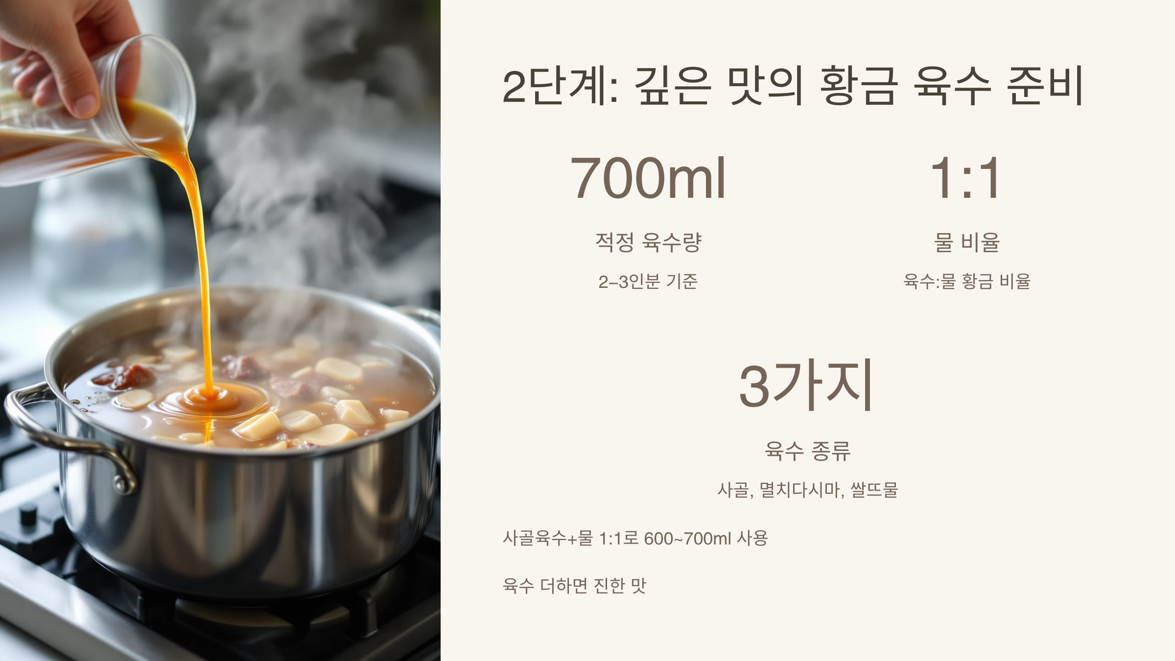 국물이 싱거울 경우 간장이나 액젓을 조금씩 추가하며 간을 맞추세요. 단, 한 번에 많이 넣지 말고 조금씩 넣어가며 맛을 보는 것이 중요합니다. 감칠맛을 더하고 싶다면 다시다 분말 1/4작은술을 추가해도 좋습니다.