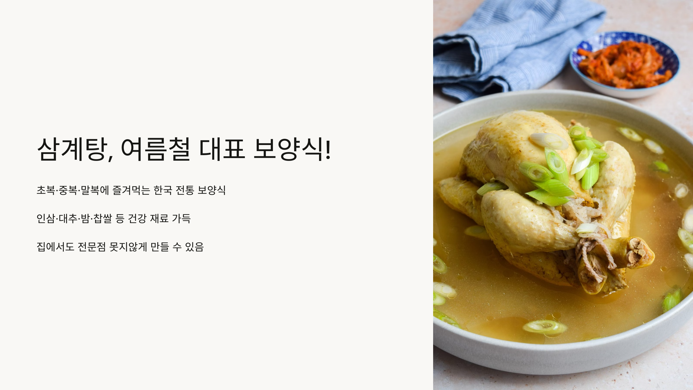 영계(어린 닭)에 인삼, 대추, 밤, 찹쌀을 넣고 푹 끓여낸 한국 전통 보양식으로, 특히 초복, 중복, 말복 시기에 즐겨 먹는 음식입니다.