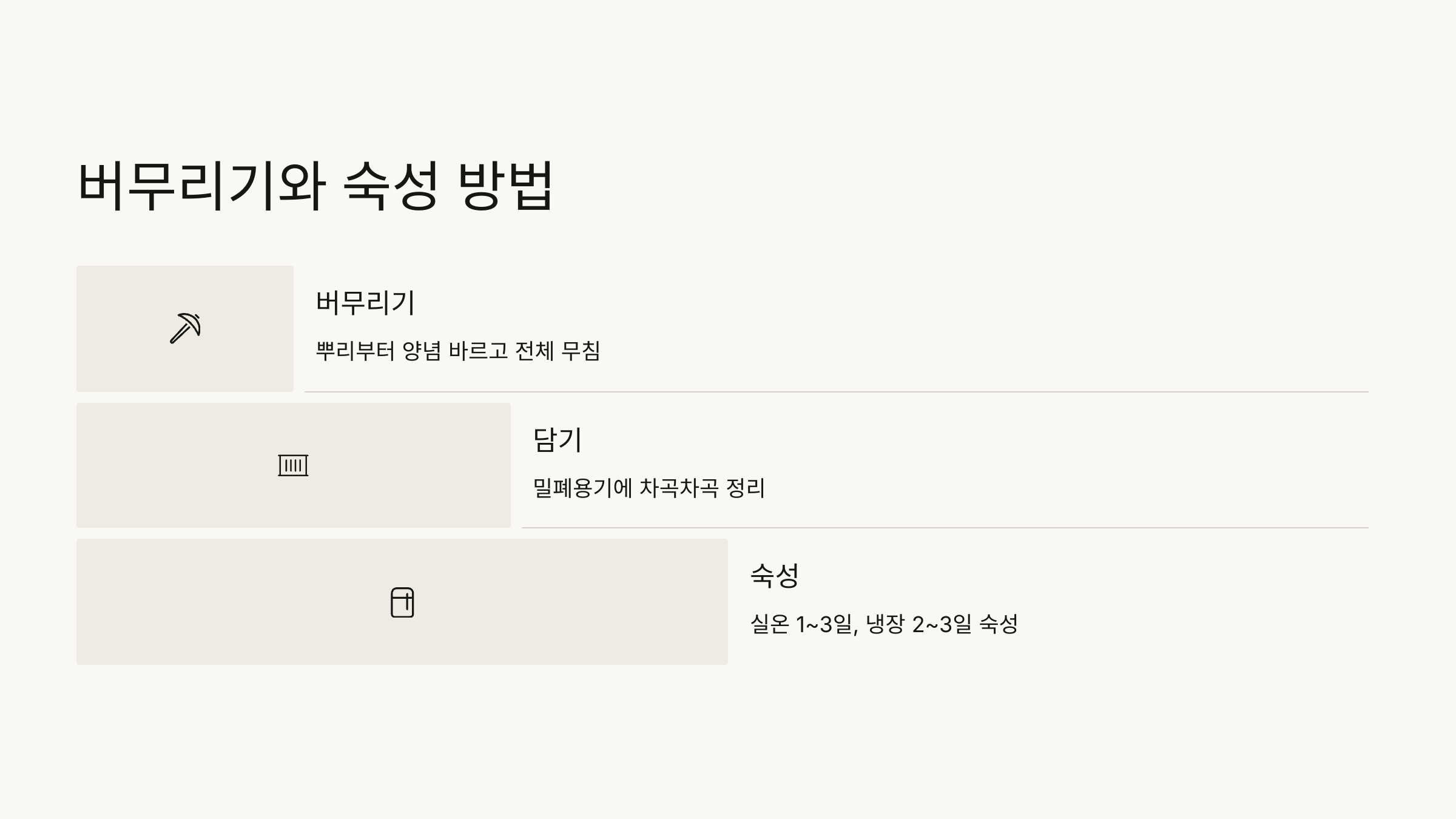 | 2일 ~ 5일 | 감칠맛 증가, 적당한 신맛 | 밥, 국수류 |