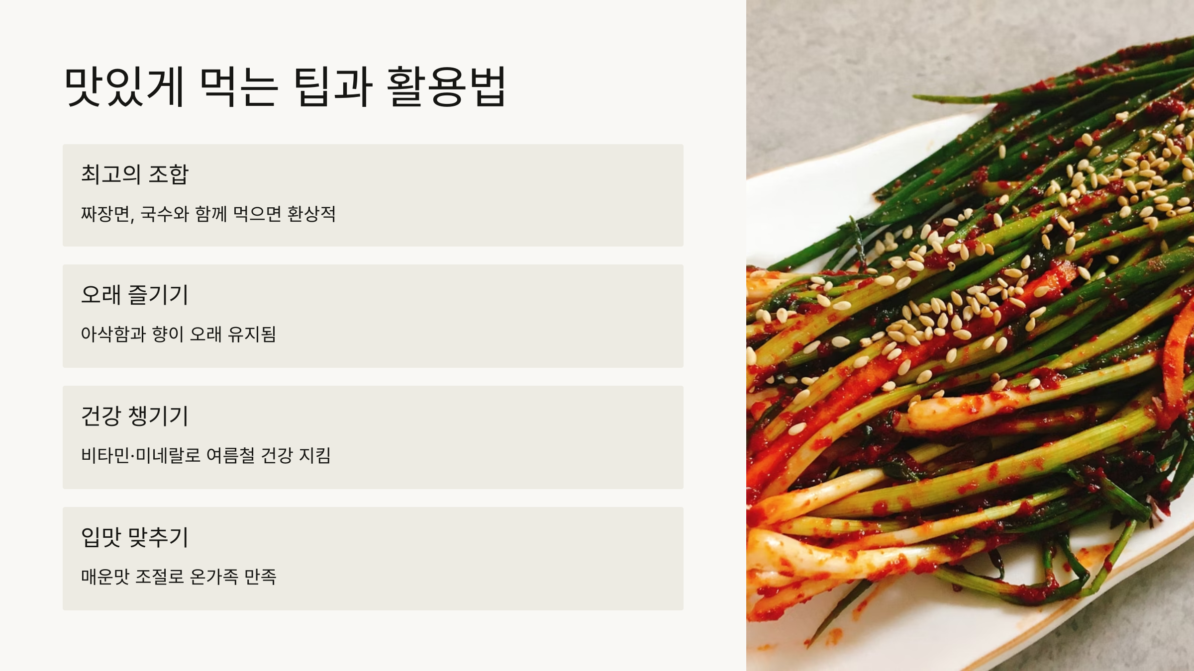 특히 숙성된 쪽파김치는 찌개나 국물 요리의 베이스로 사용하면 깊은 맛을 더해줍니다. 여름에는 냉면 위에 얹어 먹어도 상큼한 맛을 즐길 수 있습니다.