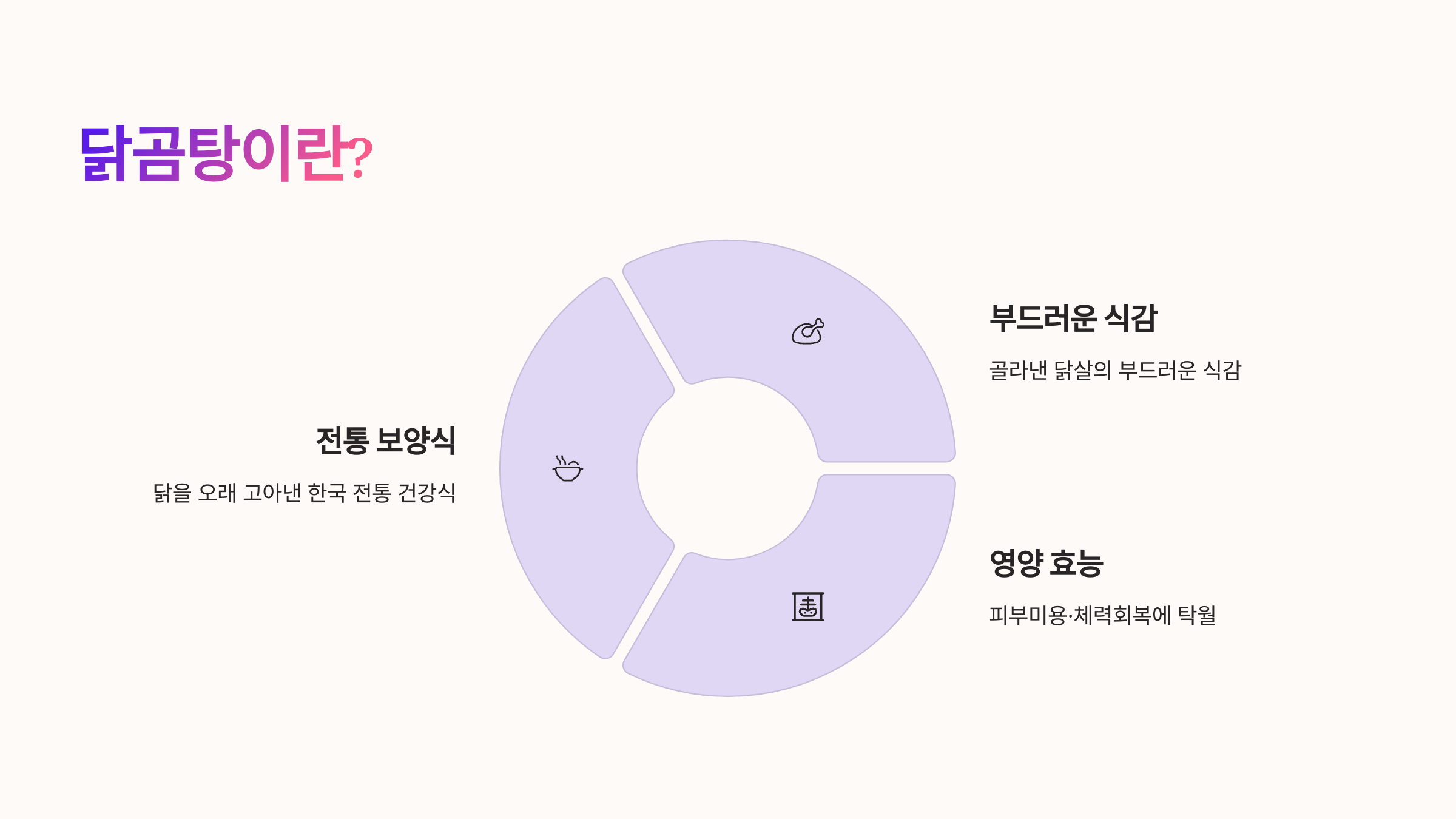 닭곰탕은 닭을 오랜 시간 푹 곤 후 닭살을 발라내어 국물과 함께 즐기는 한국 전통 보양식입니다. 진한 국물에 담긴 콜라겐과 단백질이 풍부해 피부 미용과 체력 보충에 좋은 건강식으로 알려져 있습니다.