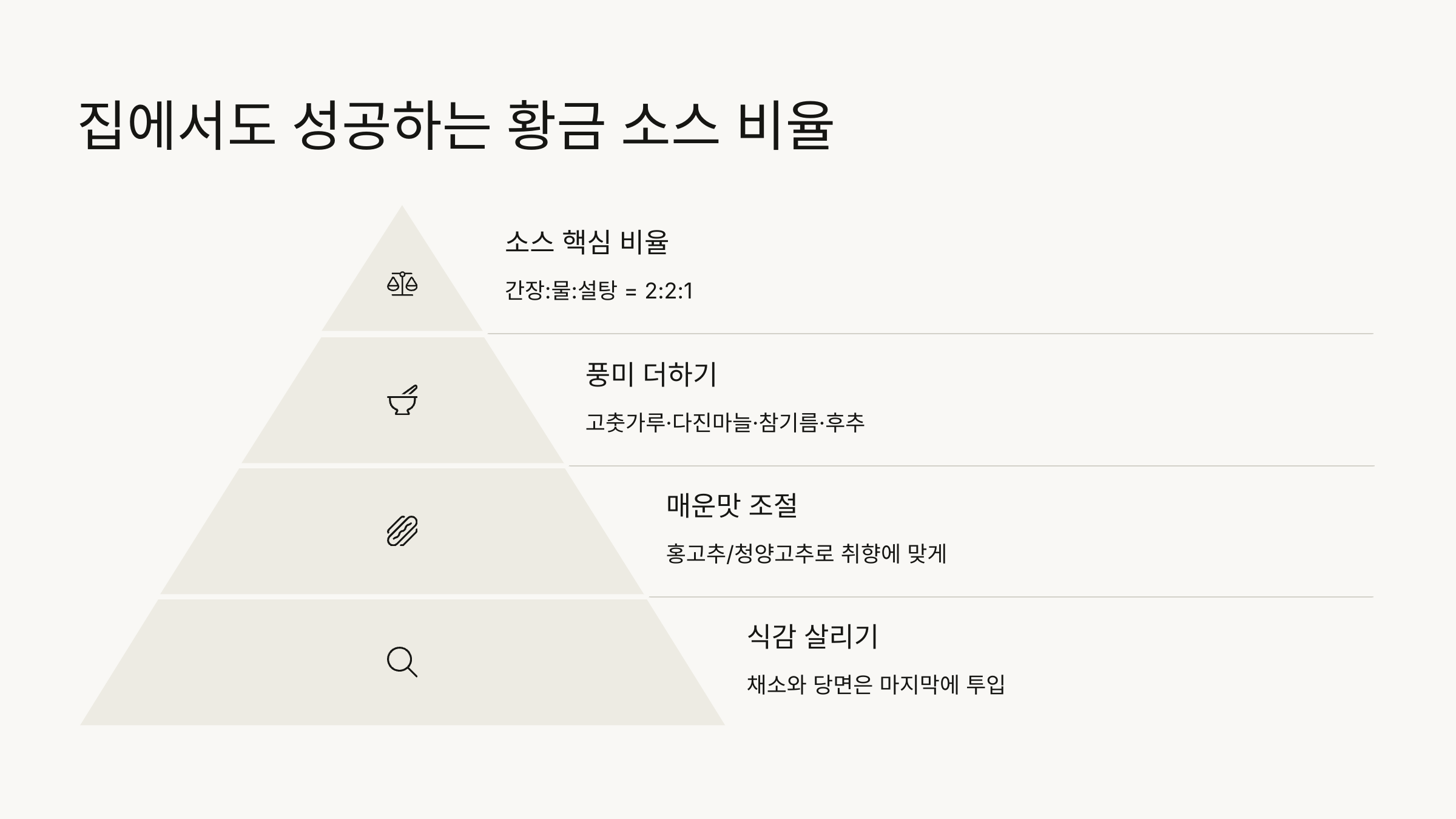 - 소스의 비율은 안동찜닭 황금레시피의 핵심입니다. 간장과 설탕의 비율을 2:1로 맞추면 감칠맛이 더해집니다.