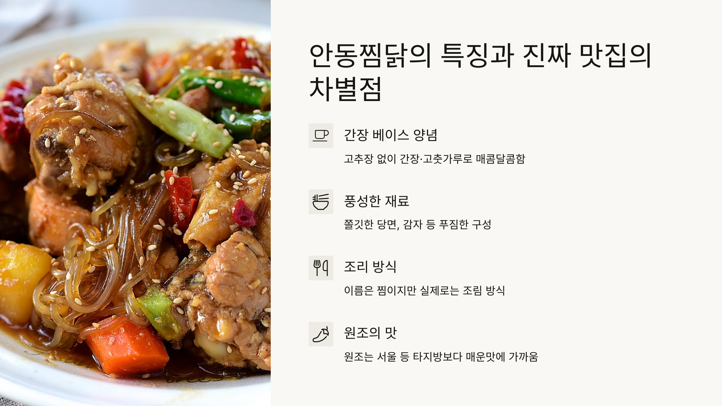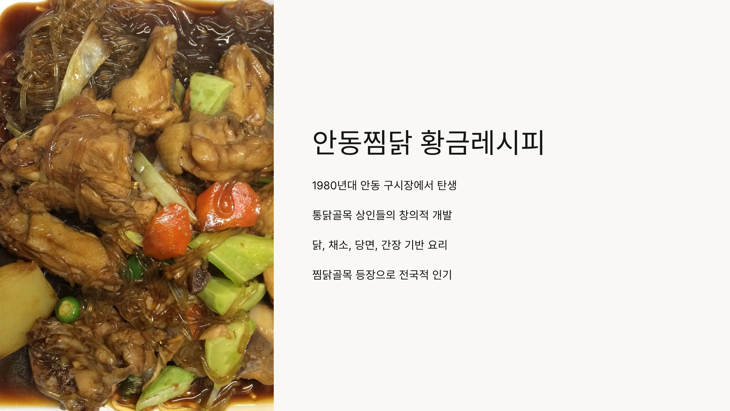 안동찜닭은 1980년대 안동 구시장에서 시작되었다고 알려져 있습니다. 원래는 닭백숙을 팔던 식당에서 남은 닭으로 새로운 요리를 개발한 것이 시초라고 합니다. 안동찜닭의 가장 큰 특징은 간장 베이스의 달콤하면서도 매콤한 양념과 쫄깃한 당면이 함께 어우러진다는 점입니다.