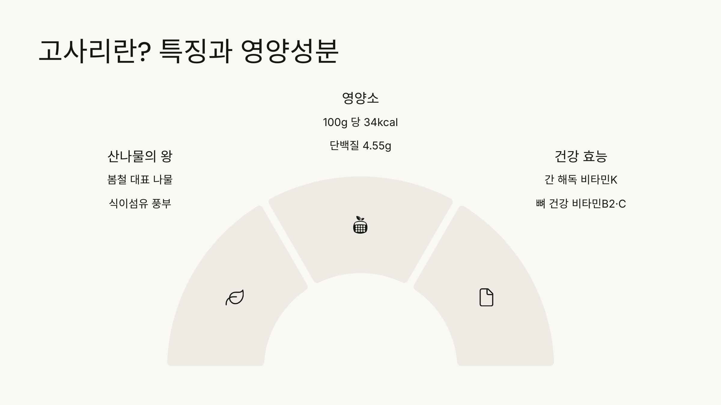 고사리는 봄철 산과 들에서 자라는 대표적인 산나물로, 식이섬유가 풍부하고 비타민, 무기질이 함유되어 있습니다. 특히 고사리에는 칼륨, 칼슘, 마그네슘 등의 미네랄이 풍부해 건강에 도움이 됩니다.