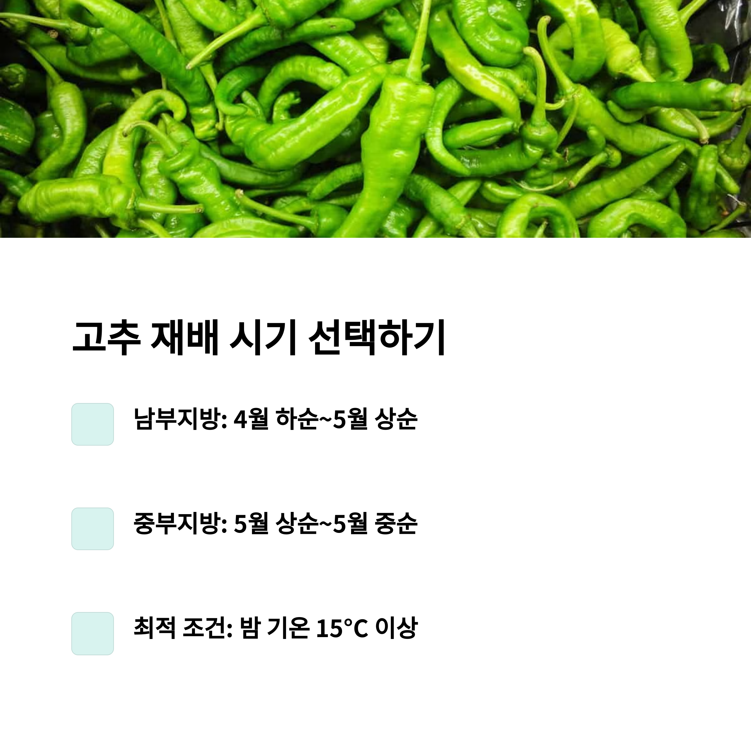 남부는 4월 하순~5월 상순, 중부는 5월 상순~5월 중순이에요. 밤 기온 15°C 이상을 확인하세요. - Q2. 고추가 잘 안 자라면 어떻하죠?