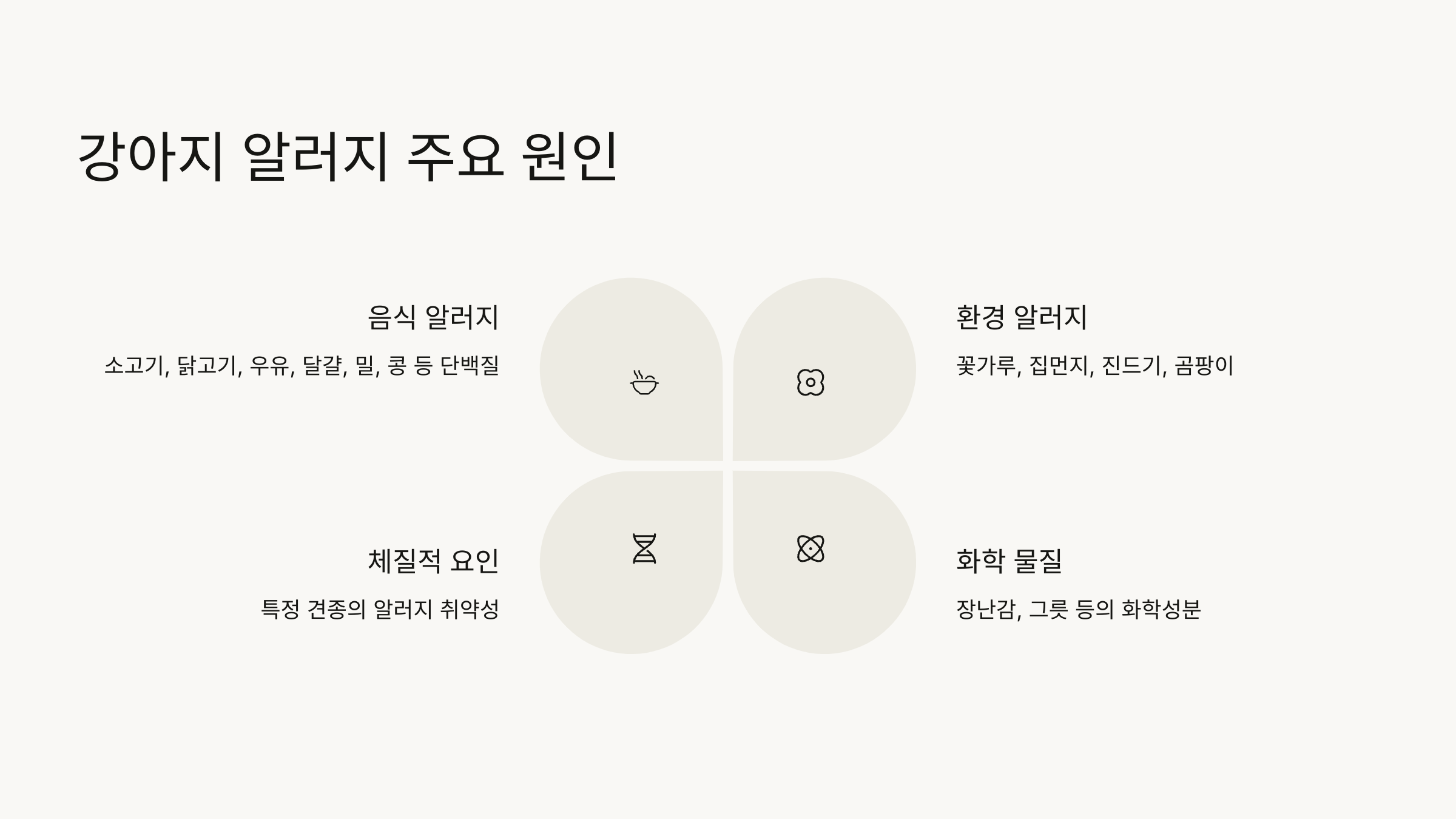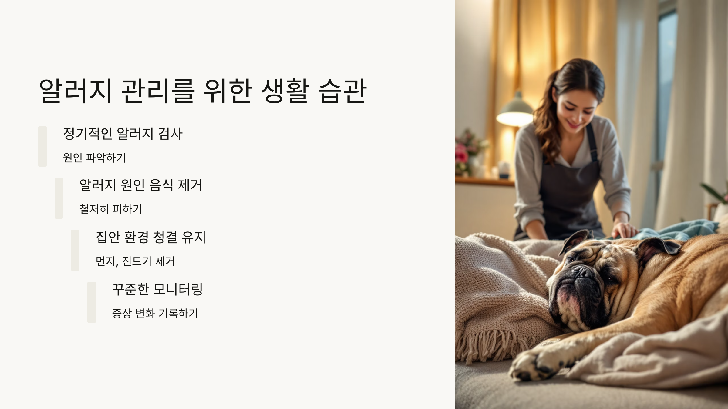 A: 식이 알러지 외에도 환경적 요인(집먼지, 꽃가루 등)이나 접촉 알러지가 원인일 수 있습니다. 또한 사료 전환 기간이 충분하지 않았거나, 간식이나 영양제를 통해 알러지 유발 성분을 섭취했을 가능성도 있습니다.
