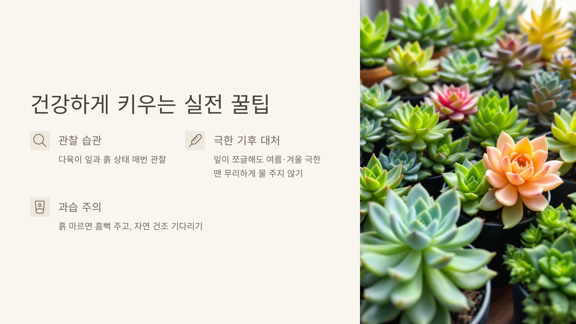이 글이 여러분의 다육이 키우기 여정에 도움이 되길 바랍니다. 건강하고 아름다운 다육이와 함께하는 일상을 즐기세요! 🌿