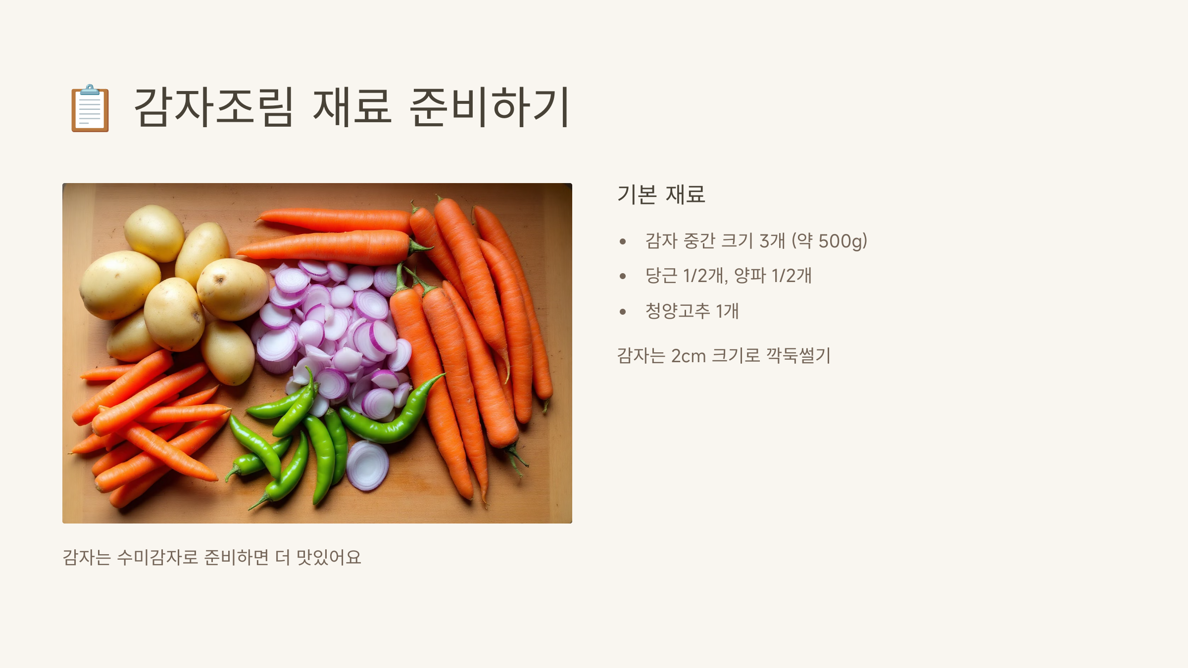 💡 TIP: 감자조림 맛있게 만드는법의 첫 번째 비결은 감자의 종류부터 신경 써야 해요. 수분이 적고 전분이 많은 '수미감자'가 조림용으로 가장 적합합니다. 감자의 크기는 일정하게 썰어 조리 시간이 고르게 되도록 해주세요.