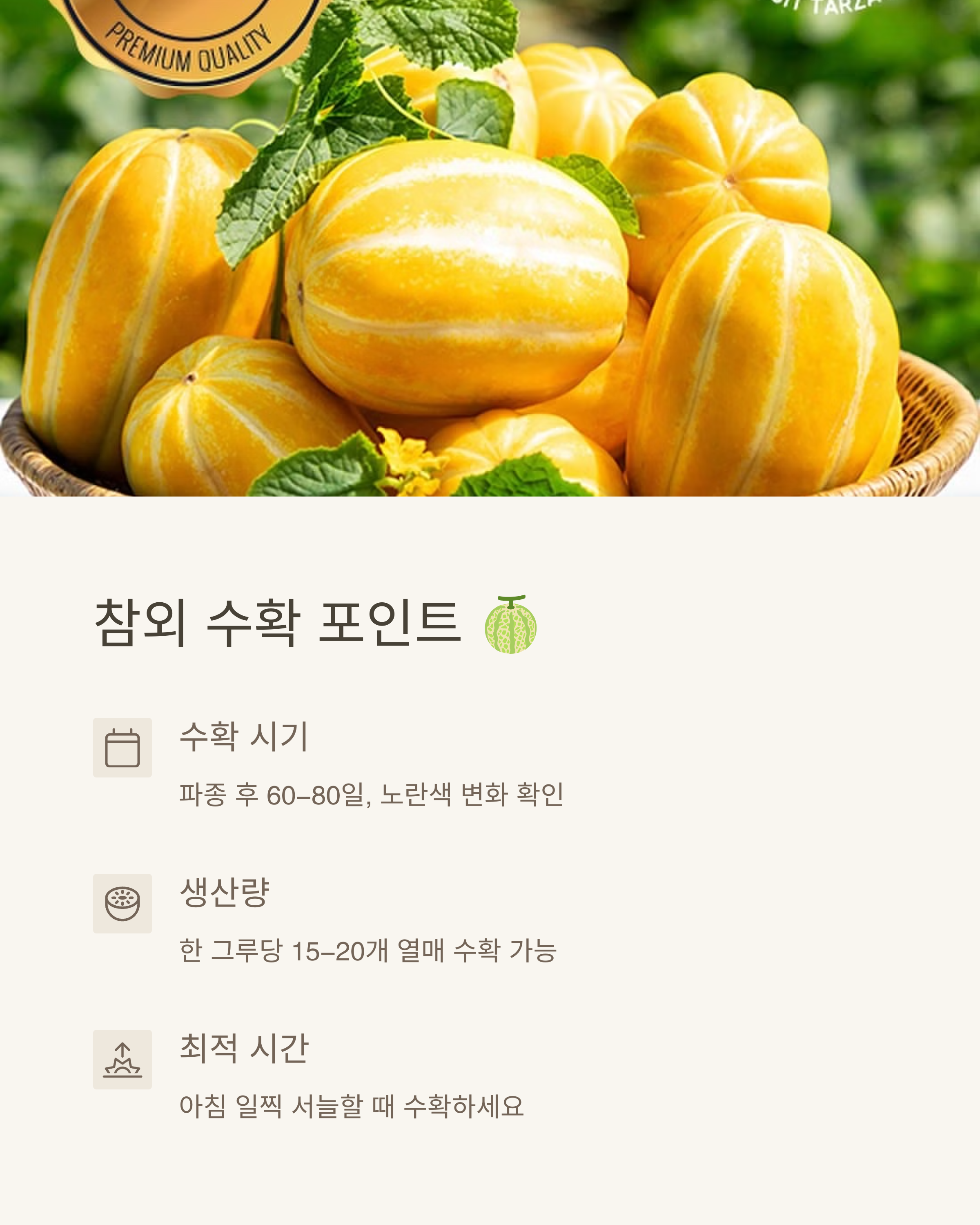 참외를 더 잘 키우려면 이 팁을 기억하세요! 🌟 낮 26~30°C, 밤 17~20°C가 최적 온도예요. 햇빛이 부족하면 열매가 덜 달콤해질 수 있으니 햇볕 좋은 곳을 선택하세요.