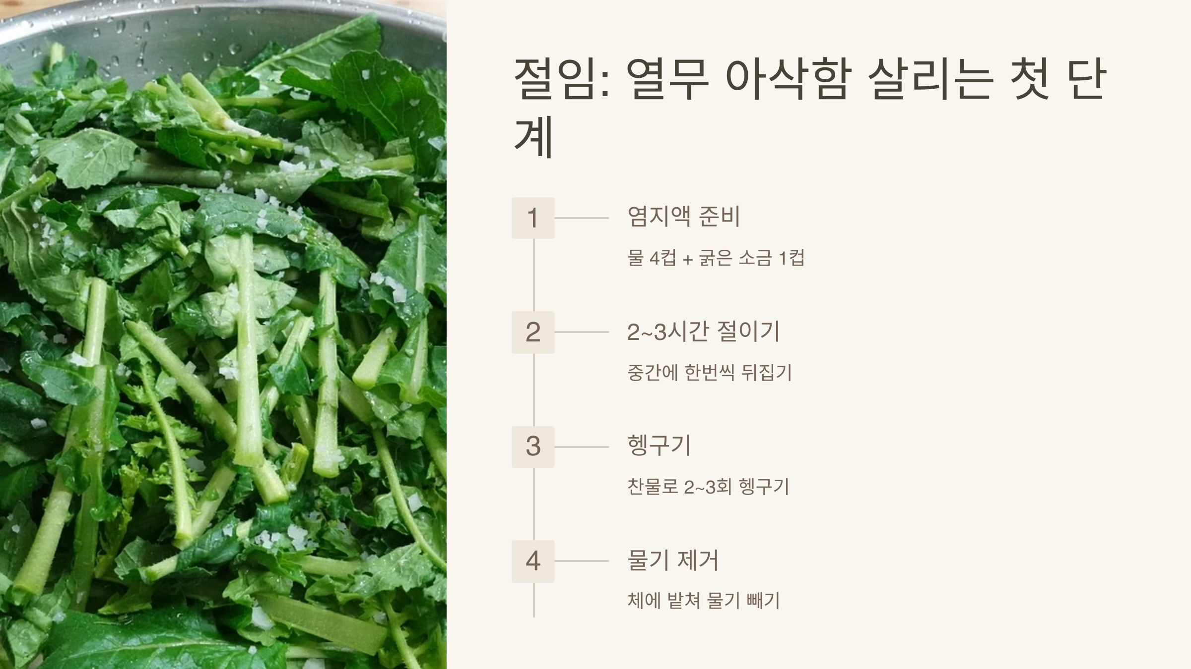 💡 팁: 열무 절이는 시간이 길수록 짜게 되므로, 1시간을 넘기지 않는 것이 좋습니다. 열무김치는 약간 덜 절인 듯한 상태로 양념하는 것이 아삭한 식감을 유지하는 비결입니다.