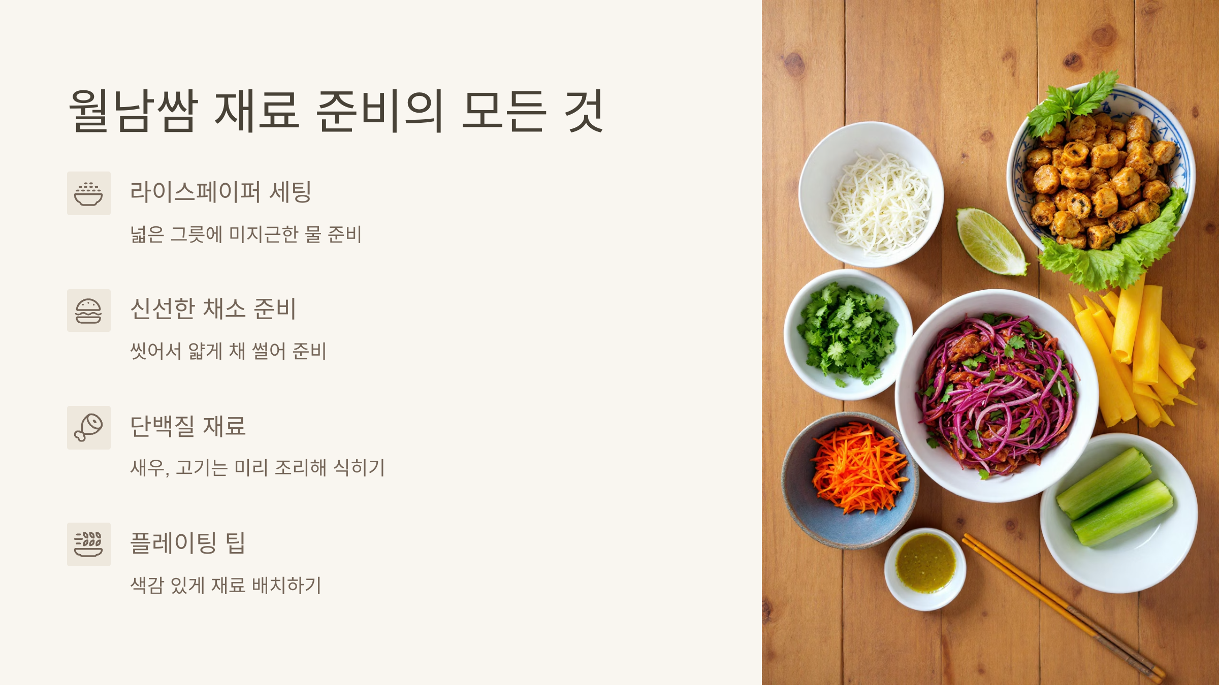 재료 준비가 끝났다면 이제 본격적으로 월남쌈 만들기를 시작해 볼까요? 생각보다 간단하니 겁먹지 마세요! 아래 순서대로 따라 하면 누구나 맛있는 월남쌈을 완성할 수 있습니다.